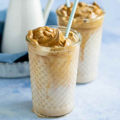 2Pour Kölln oat drink and ice cubes into a glass and top with the coffee foam. Place a spoon or straw in the glass and enjoy