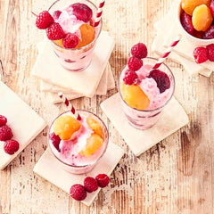 1Pour the grape and apricot juices separately into an ice ball bag and freeze for about 4 hours. Sort the raspberries and puree them together with kefir, yoghurt and Cologne flakes.
