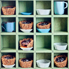 1Place all dough ingredients in a high-performance blender or food processor and mix until all ingredients are well mixed. You should get a very sticky mass. Chill for 15 minutes. Press into the wells of a muffin tin so that only the bottom and the edge are covered and form cupcakes. Chill for 30 minutes.