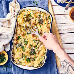 4Mix sour cream with whipped cream. Add the broth and Echte Kölln Kernige, season with salt, pepper and nutmeg and pour over the casserole. Grate cheese and sprinkle on top. Bake on the middle shelf until the cheese is golden brown.