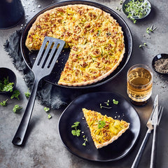 3Place the leek pieces with the cut side facing up on the dough base, spread the minced carrot mixture in the gaps and press down. Mix the egg yolks with the cream, pour evenly over the mixture and bake. Top/bottom heat: 200°C Circulating air: 180°C Baking time: approx. 30 minutes Preparation time: approx. 45 minutes
