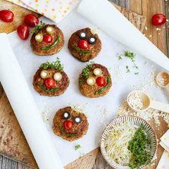 2To garnish, pipe sour cream onto the meatballs using a piping bag as eyes. Cut “pupils” out of the olives and use them to complete the eyes. Wash the tomatoes, cut them in half crosswise and place them on the meatballs as noses. Blanch the chive stalks briefly, rinse them in cold water, pat them dry and shape them into friendly mouths. Use the sprouts (or cress) as hair and serve the meatballs. Preparation time: 30 minutes (excluding waiting time)