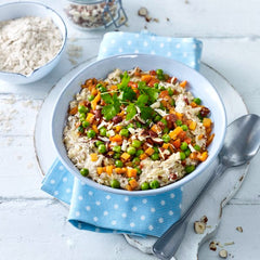 5Bring 800 ml of vegetable stock to the boil in a pot. Remove from heat. Add Kölln oat bran flakes and finely chopped nuts, stir in and let swell for 2-3 minutes. Stir in chopped parsley. Arrange porridge in bowls. Pour the vegetable mixture on top. Sprinkle with coarsely chopped nuts and garnish with remaining parsley. Preparation time approx. 45 minutes