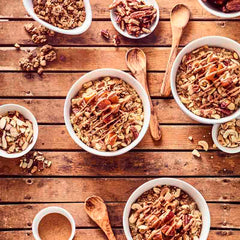 2Pour the porridge into a bowl and add Kölln muesli. Place nuts and date pieces on the porridge and garnish with almond butter.