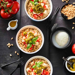 2Pour the porridge into a bowl and add the tomato and mozzarella cubes. Drizzle Mazola® and pesto over the porridge and garnish with Kölln Haferfleks®.