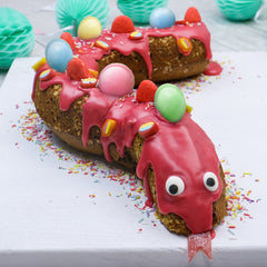 4Mix the powdered sugar and juice into a icing and spread it over the snake. Press candy into the mold as eyes, mouth and tongue. The UFOs from Hitschler are particularly good as back decoration. Sprinkle the snake with colorful sprinkles.
