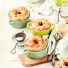 2Grease 12 thick-walled cups or soufflé molds (6 cm) with Mazola® and spoon the dough into them. Press 1 piece of chocolate into the dough and bake. Let cool and dust with powdered sugar. Top/bottom heat: 180 °C Circulating air: 160°C Baking time: approx. 25 minutes Preparation time: approx. 15 minutes