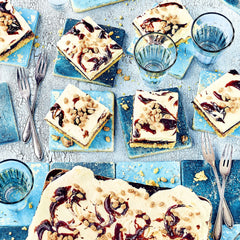 4After cooling, spread with 350 g of plum jam. Beat the cream until stiff, spread on the cake and decorate with the remaining plum jam. Finally, distribute the Kölln Haferfleks® over the sheet metal friezes. Refrigerate before serving!