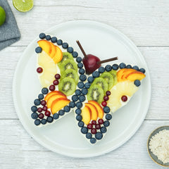 3Decorate the butterfly cake with fruit as desired. Soft fruits such as raspberries and blueberries, oranges, bananas, tangerines and grapes are particularly suitable for this.