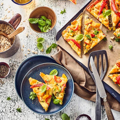 4Bake on the middle shelf. Cut into triangles and serve warm or cold. Makes approx. 18 pieces. Top/bottom heat: 200°C Circulating air: 180°C Baking time: approx. 30-40 minutes Preparation time: approx. 40 minutes